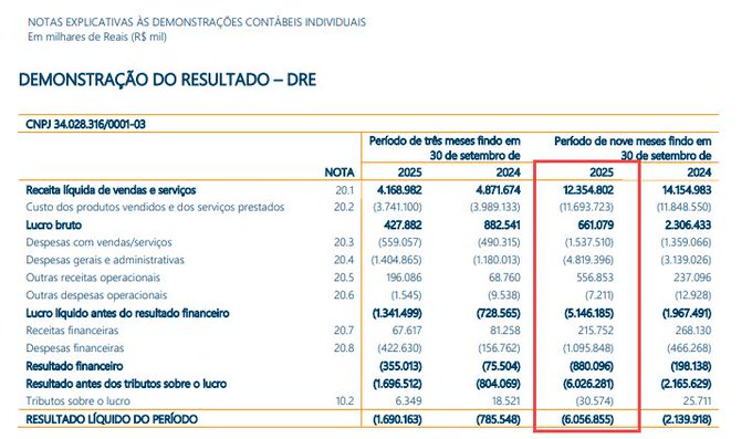No acumulado até set/2025, o prejuízo passou para R$ 6,06 bilhões.