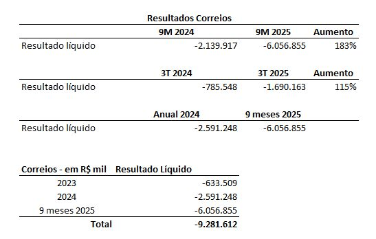 E assim, chegamos ao prejuízo dos Correios de R$ 6,06 bilhões em 9 meses de 2025.