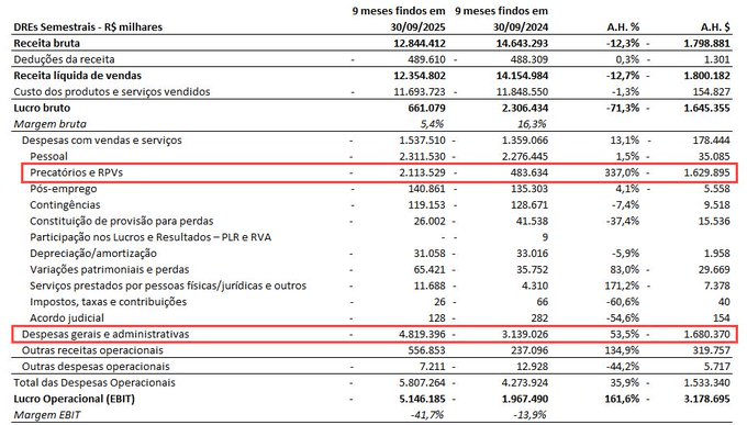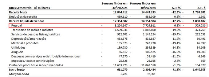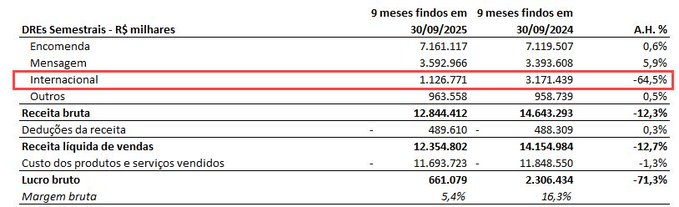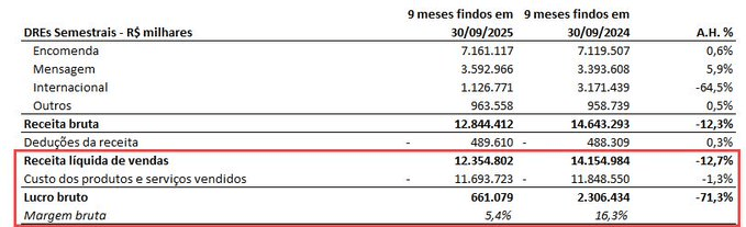 Com isso, o prejuízo operacional dos Correios foi de R$ 5,14 bilhões nos 9 meses de 2025, um aumento de 161,6% (+R$ 3,18 bilhões) no prejuízo operacional.