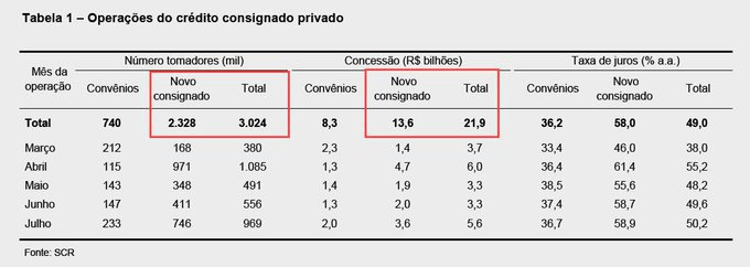Segundo o BCB, cerca de 3 milhões de pessoas tomaram consignado entre março e julho deste ano, sendo cerca de 2,3 milhões de pessoas por meio do Crédito do Trabalhador.