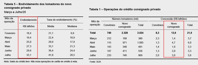Outro ponto destacado é que o aumento no endividamento (R$ 14,7 bi) é maior que o montante concedido no novo consignado (R$ 13,6 bi), o que indica que houve tomada de crédito em outras modalidades também.