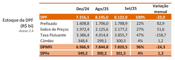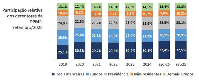 Como sempre volta a discussão de quem está se beneficiando com isso, resolvi ir olhar o relatório da dívida pública federal para ver a composição atualizada (set/2025) de credores.