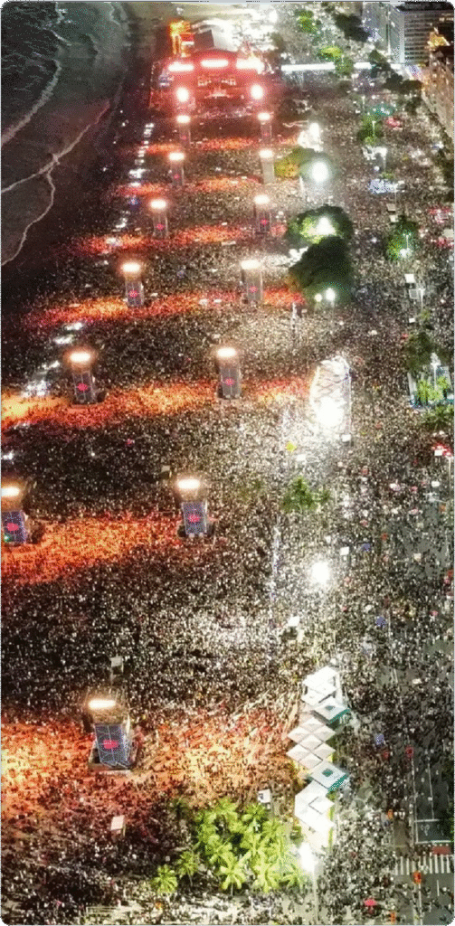 1. O público do show da Lady Gaga ultrapassou o Hotel Hilton, logo pode-se estimar uma área de no mínimo 130 mil km/2. O público dela tbm ocupou uma área maior na Avenida Atlântica (comparado ao ano passado), então estimemos uma área total de 140 mil km/2. Levando em conta a densidade q vc estimou pro show da Madona em 2024 (6 pessoas por m/2), a Lady Gaga teve um público de (ao menos) 850 mil pessoas, não foi menor q o show da madona, e pela “muvuca” sem precedentes q estava aquilo lá, não duvido ter passado de 1 milhão fácil.