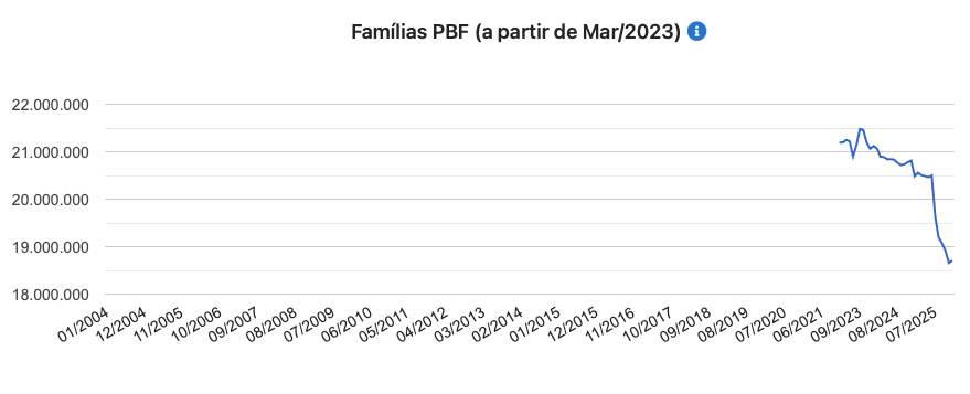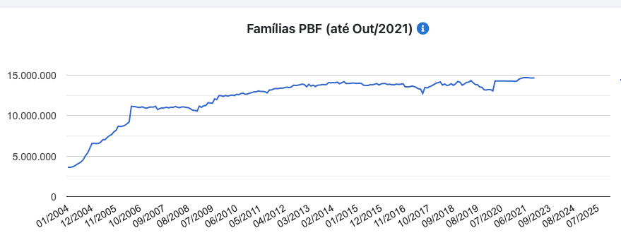 Eis aqui um caso de desinformação sutil: no Painel de Monitoramento do Programa Bolsa Família, há dois gráficos mostrando a série histórica com o número de famílias beneficiadas. O primeiro vai até outubro de 2021: